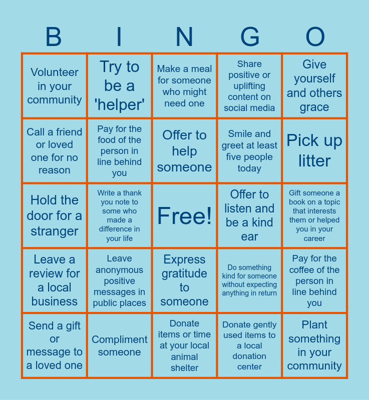 This bingo card has a free space and 24 words: Leave anonymous positive messages in public places, Compliment someone, Offer to help someone, Send a gift or message to a loved one, Give yourself and others grace, Volunteer in your community, Call a friend or loved one for no reason, Try to be a 'helper', Offer to listen and be a kind ear, Express gratitude to someone, Smile and greet at least five people today, Hold the door for a stranger, Do something kind for someone without expecting anything in return, Pay for the coffee of the person in line behind you, Pay for the food of the person in line behind you, Donate gently used items to a local donation center, Gift someone a book on a topic that interests them or helped you in your career, Make a meal for someone who might need one, Pick up litter, Write a thank you note to some who made a difference in your life, Plant something in your community, Leave a review for a local business, Share positive or uplifting content on social media and Donate items or time at your local animal shelter.