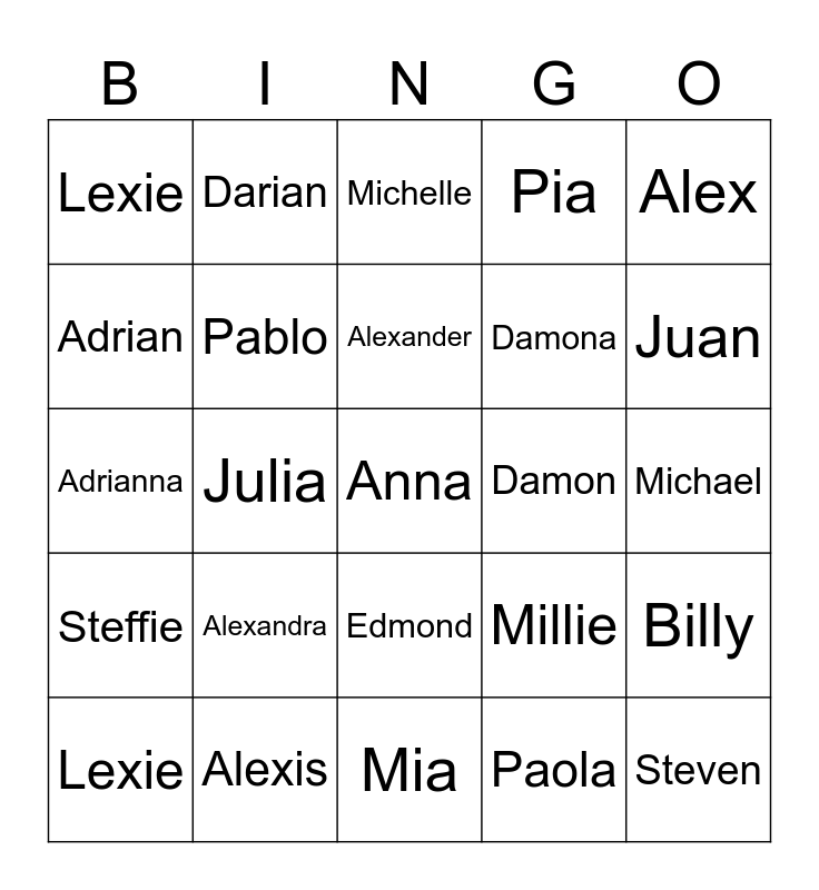 This bingo card has a free space and 24 words: Alexandra, Alexis, Alexander, Lexie, Alex, Lexie, Adrian, Darian, Damon, Edmond, Damona, Adrianna, Millie, Billy, Pablo, Paola, Michael, Michelle, Juan, Julia, Steven, Steffie, Pia and Mia.
