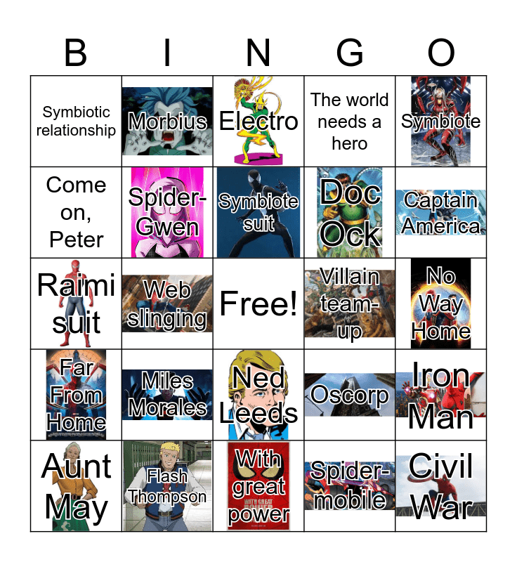 This bingo card has 75 images, a free space and 93 words: Peter Parker, Friendly neighborhood, With great power, Great responsibility, Spider-Sense is tingling, Mary Jane Watson, Uncle Ben, Aunt May, Web-shooters, Wall-crawling, Daily Bugle, J. Jonah Jameson, Green Goblin, Doc Ock, Venom, Symbiote, Electro, The Lizard, Vulture, Sandman, Mysterio, Kingpin, Hobgoblin, Kraven the Hunter, Miles Morales, Spider-Gwen, Spider-Ham, Spider-Verse, Norman Osborn, Harry Osborn, Flash Thompson, Ned Leeds, Gwen Stacy, Black Cat, Morbius, The Prowler, Iron Spider, Venom-verse, Symbiote suit, Oscorp, Raimi suit, Far From Home, No Way Home, Homecoming, Civil War, New York City, Queens, Pizza time, Upside-down kiss, Train fight, Spider-tracer, Spider-mobile, Spider-bot, Spider-armor, Negative zone suit, Superior Spider-Man, Big apple, Web of Life and Destiny, Spider totem, Comic book panel, Web slinging, Parker luck, A leap of faith, You're not a nobody, The story of my life, My gift, my curse, It's just what I had to do, That's all it is, Come on, Peter, I'm stuck, I'm your friendly neighborhood Spider-Man, Nah, I'mma do my own thing, Who am I?, The world needs a hero, Don't mess with Empire State University, Avengers, Captain America, Iron Man, Tony Stark, Infinity War, Endgame, Multiverse, Villain team-up, Symbiotic relationship, Radioactive spider, With a great burden, Responsibility brings power, We have to be greater than what we suffer, The one thing they love more than a hero, Happy Hogan, Cunning warrior attacks heart, Heads up and I'll clear a path.