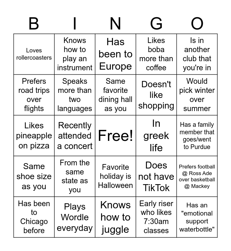 This bingo card has a free space and 24 words: From the same state as you, Plays Wordle everyday, Same favorite dining hall as you, Has been to Chicago before, Is in another club that you're in, Loves rollercoasters, Prefers road trips over flights, Knows how to play an instrument, In greek life, Favorite holiday is Halloween, Doesn't like shopping, Likes pineapple on pizza, Does not have TikTok, Prefers football @ Ross Ade over basketball @ Mackey, Speaks more than two languages, Early riser who likes 7:30am classes, Has a family member that goes/went to Purdue, Has been to Europe, Would pick winter over summer, Recently attended a concert, Has an "emotional support waterbottle", Same shoe size as you, Likes boba more than coffee and Knows how to juggle.