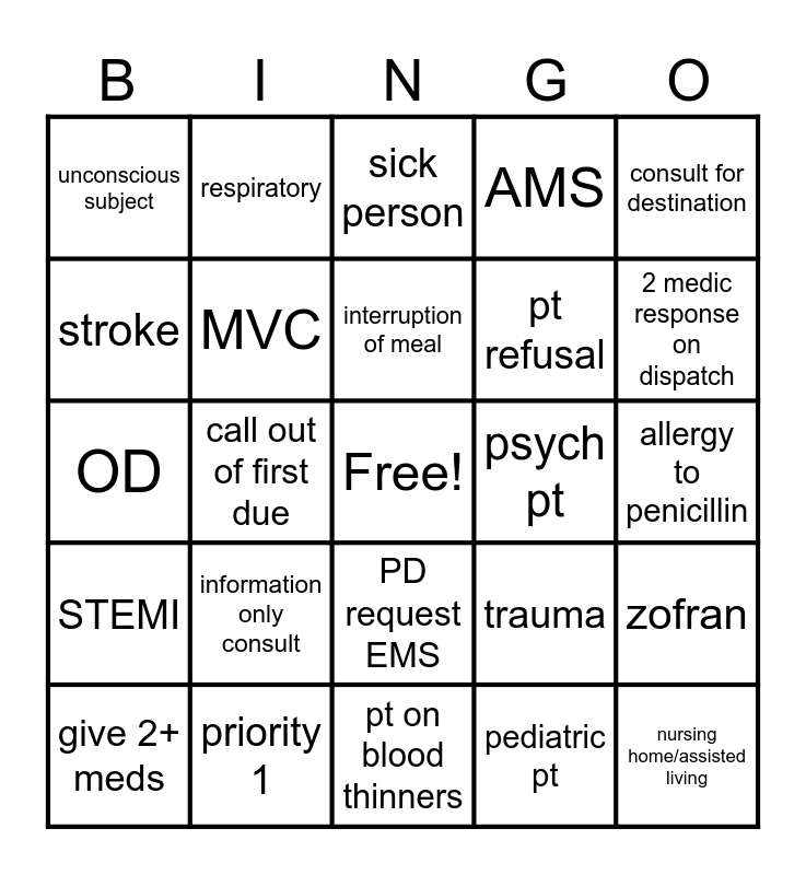 This bingo card has a free space and 30 words: priority 1, priority 3, call out of first due, flyout, unconscious subject, sick person, MVC, PD request EMS, psych pt, pt on blood thinners, allergy to penicillin, nursing home/assisted living, pediatric pt, engine company, 2 medic response on dispatch, sepsis, trauma, STEMI, information only consult, consult for destination, OD, cardiac arrest, respiratory, pt refusal, stroke, AMS, zofran, give 2+ meds, interruption of meal and backboard/collar on pt.