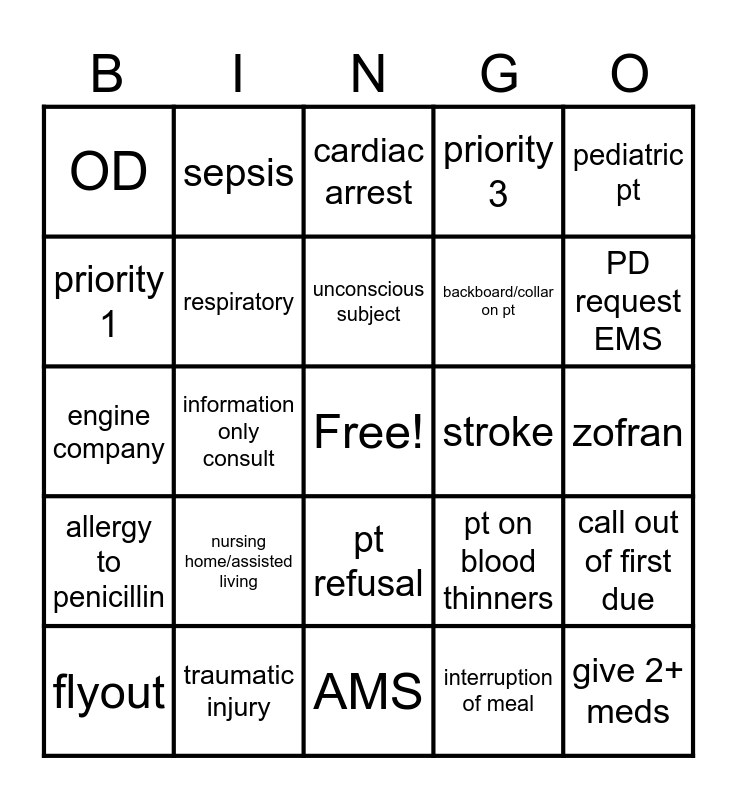 This bingo card has a free space and 30 words: traumatic injury, STEMI, information only consult, consult for destination, OD, cardiac arrest, respiratory, pt refusal, stroke, AMS, zofran, give 2+ meds, interruption of meal, MVC, PD request EMS, psych pt, pt on blood thinners, allergy to penicillin, nursing home/assisted living, pediatric pt, engine company, 2 medic response on dispatch, sepsis, backboard/collar on pt, priority 1, priority 3, call out of first due, flyout, unconscious subject and sick person.