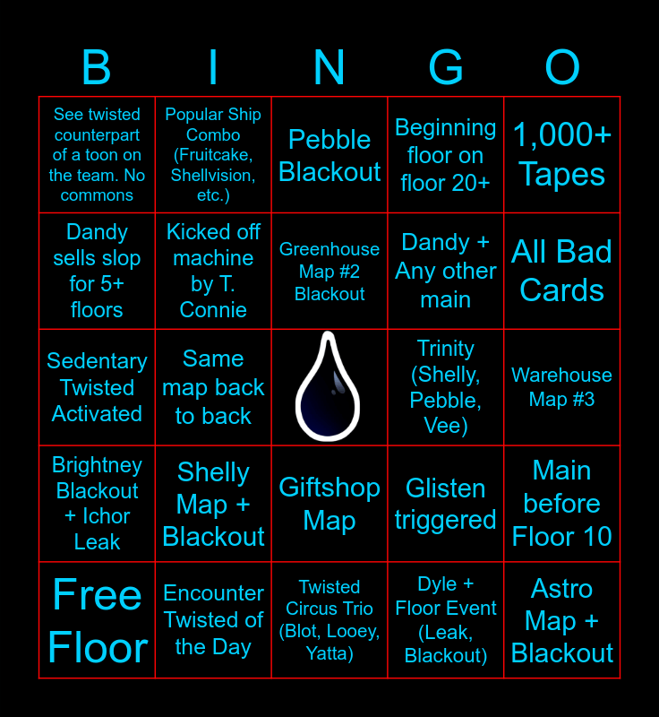 This bingo card has a free space and 24 words: Shelly Map + Blackout, Encounter Twisted of the Day, Greenhouse Map #2 Blackout, Free Floor, 1,000+ Tapes, See twisted counterpart of a toon on the team. No commons, Dandy sells slop for 5+ floors, Popular Ship Combo (Fruitcake, Shellvision, etc.), Trinity (Shelly, Pebble, Vee), Giftshop Map, Dandy + Any other main, Sedentary Twisted Activated, Glisten triggered, Main before Floor 10, Kicked off machine by T. Connie, Dyle + Floor Event (Leak, Blackout), Warehouse Map #3, Pebble Blackout, All Bad Cards, Same map back to back, Astro Map + Blackout, Brightney Blackout + Ichor Leak, Beginning floor on floor 20+ and Twisted Circus Trio (Blot, Looey, Yatta).