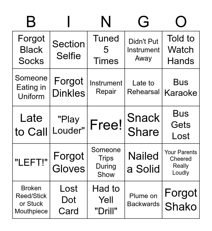 This bingo card has a free space and 24 words: Forgot Gloves, Lost Dot Card, Instrument Repair, Broken Reed/Stick or Stuck Mouthpiece, Told to Watch Hands, Forgot Black Socks, Someone Eating in Uniform, Section Selfie, Snack Share, Someone Trips During Show, Late to Rehearsal, Late to Call, Nailed a Solid, Your Parents Cheered Really Loudly, Forgot Dinkles, Plume on Backwards, Bus Gets Lost, Tuned 5 Times, Bus Karaoke, "Play Louder", Forgot Shako, "LEFT!", Didn't Put Instrument Away and Had to Yell "Drill".