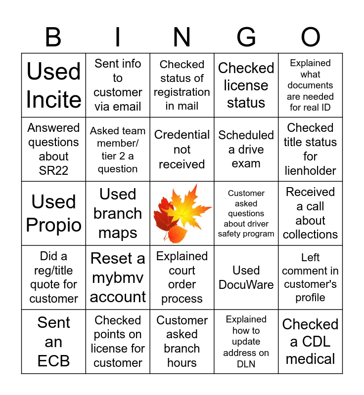 This bingo card has a free space and 24 words: Reset a mybmv account, Checked points on license for customer, Credential not received, Sent an ECB, Explained what documents are needed for real ID, Used Incite, Answered questions about SR22, Sent info to customer via email, Customer asked questions about driver safety program, Explained court order process, Scheduled a drive exam, Used Propio, Used DocuWare, Left comment in customer's profile, Asked team member/ tier 2 a question, Explained how to update address on DLN, Received a call about collections, Checked status of registration in mail, Checked title status for lienholder, Used branch maps, Checked a CDL medical, Did a reg/title quote for customer, Checked license status and Customer asked branch hours.