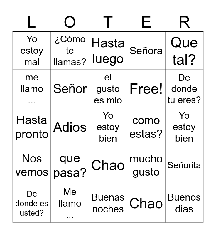 This bingo card has a free space and 47 words: Hola, Buenos dias, Buenas tardes, Buenas noches, que pasa?, nada, ¿Cómo te llamas?, ¿Cómo se llama usted?, me llamo ..., Yo soy ..., Señor, Señora, Señorita, mucho gusto, encantado(a), igualmente, el gusto es mio, como estas?, ¿Cómo esta usted?, Que tal?, Adios, Chao, Yo estoy mal, Free!, Yo estoy más o menos, De donde tu eres?, De donde es usted?, Adios, Chao, Nos vemos, Hasta luego, Hasta mañana, Gracias, De nada, yo estoy..., Me llamo ..., Yo estoy bien, Yo estoy más o menos, ¿De dónde eres tú?, ¿De dónde es usted?, Nos vemos, Hasta luego, Hasta pronto, Hasta mañana, Gracias, De nada and muy bien.