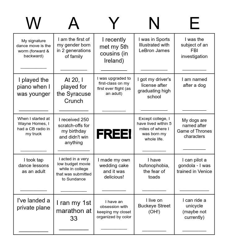 This bingo card has a free space and 30 words: I ran my 1st marathon at 33 ________, I had a dog named Toffee and a cat named Caramel ___________, I received 250 scratch-offs for my birthday and didn't win anything ____________, I love a rare steak; barely kissing the heat before hitting my plate ___________, My signature dance move is the worm (forward & backward) ___________, I recently met my 5th cousins (in Ireland) ________, At 20, I played for the Syracuse Crunch _________, I made my own wedding cake and it was delicious! _________, Except college, I have lived within 5 miles of where I was born my whole life. __________, I have an obsession with keeping my closet organized by color ___________, My dogs are named after Game of Thrones characters _________, I can ride a unicycle (maybe not currently) _________, I live on Buckeye Street (OH!) _________, I celebrate Tracy Gershom's birthday for another reason __________, I am named after a dog _________, I let Snoop Dogg inspire my college discipline __________, I have bufonophobia, the fear of toads _________, I took tap dance lessons as an adult __________, I acted in a very low budget movie while in college that was submitted to Sundance ___________, I was the subject of an FBI investigation _________, When I started at Wayne Homes, I had a CB radio in my truck ___________, I broke my wrist "car surfing" when I was 13 ___________, I am the first of my gender born in 2 generations of family __________, I got my driver's license after graduating high school __________, I played the piano when I was younger _________, I was in Sports Illustrated with LeBron James __________, I can pilot a gondola - I was trained in Venice ___________, I've landed a private plane _________, I was upgraded to first-class on my first ever flight (as an adult) __________ and I was in my last semester of college when I decided NOT to pursue a career in my degree _____________.