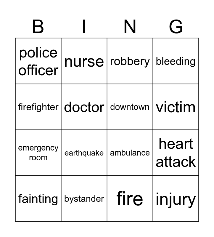 This bingo card has 24 words: Free!, witness, victim, paramedic, firefighter, police officer, doctor, nurse, bystander, hospital, emergency room, ambulance, fire station, police station, downtown, car accident, fire, robbery, earthquake, heart attack, fainting, injury, bleeding and choking.