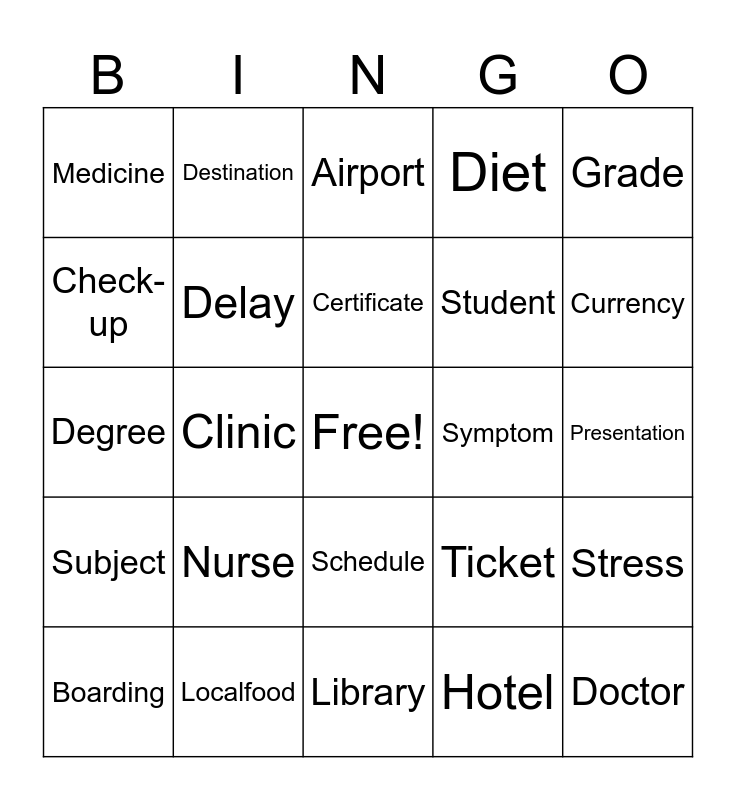This bingo card has a free space and 74 words: Accommodation, Adventure, Airport, Ambulance, Appointment, Assignment, Backpack, Blood, Boarding, Book, Bus, Campus, Certificate, Check-up, Classroom, Clinic, Course, Currency, Customs, Degree, Delay, Destination, Diet, Diploma, Doctor, Emergency, Essay, Exam, Excursion, Exercise, Grade, Guide, Healthy, Homework, Hospital, Hotel, Illness, Injury, Journey, Lecture, Library, Localfood, Luggage, Map, Mark, Medicine, Notes, Nurse, Operation, Passport, Patient, Pharmacy, Presentation, Recovery, Research, Reservation, Schedule, Seminar, Souvenir, Stress, Student, Study, Subject, Surgery, Symptom, Teacher, Textbook, Therapy, Ticket, Tourist, Tour, Treatment, Vaccinе and Visa.