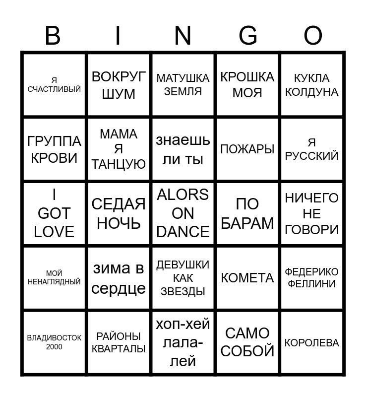 This bingo card has 25 words: зима в сердце, хоп-хей лала-лей, знаешь ли ты, ВЛАДИВОСТОК 2000, КУКЛА КОЛДУНА, Я СЧАСТЛИВЫЙ, ГРУППА КРОВИ, ВОКРУГ ШУМ, ПО БАРАМ, ДЕВУШКИ КАК ЗВЕЗДЫ, ПОЖАРЫ, I GOT LOVE, КОМЕТА, ФЕДЕРИКО ФЕЛЛИНИ, МАМА Я ТАНЦУЮ, КОРОЛЕВА, НИЧЕГО НЕ ГОВОРИ, МАТУШКА ЗЕМЛЯ, Я РУССКИЙ, СЕДАЯ НОЧЬ, ALORS ON DANCE, РАЙОНЫ КВАРТАЛЫ, МОЙ НЕНАГЛЯДНЫЙ, КРОШКА МОЯ and САМО СОБОЙ.