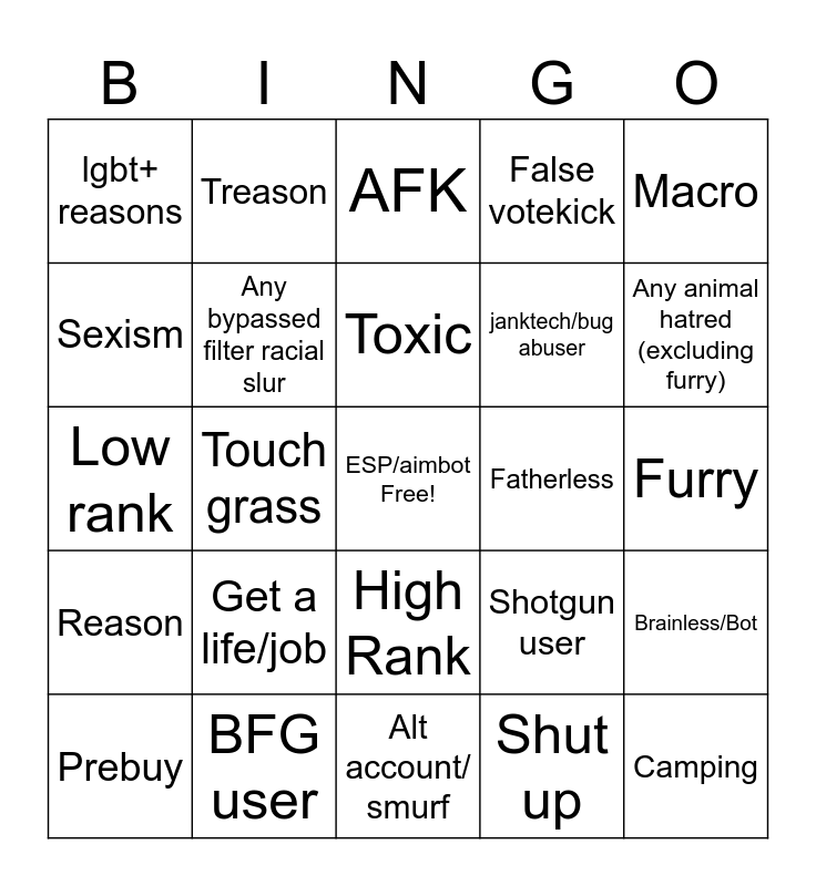 This bingo card has a free space and 24 words: Get a life/job, BFG user, Toxic, Prebuy, Macro, lgbt+ reasons, Sexism, Treason, Fatherless, High Rank, janktech/bug abuser, Low rank, Shotgun user, Brainless/Bot, Any bypassed filter racial slur, Shut up, Furry, AFK, Any animal hatred (excluding furry), Touch grass, Camping, Reason, False votekick and Alt account/ smurf.