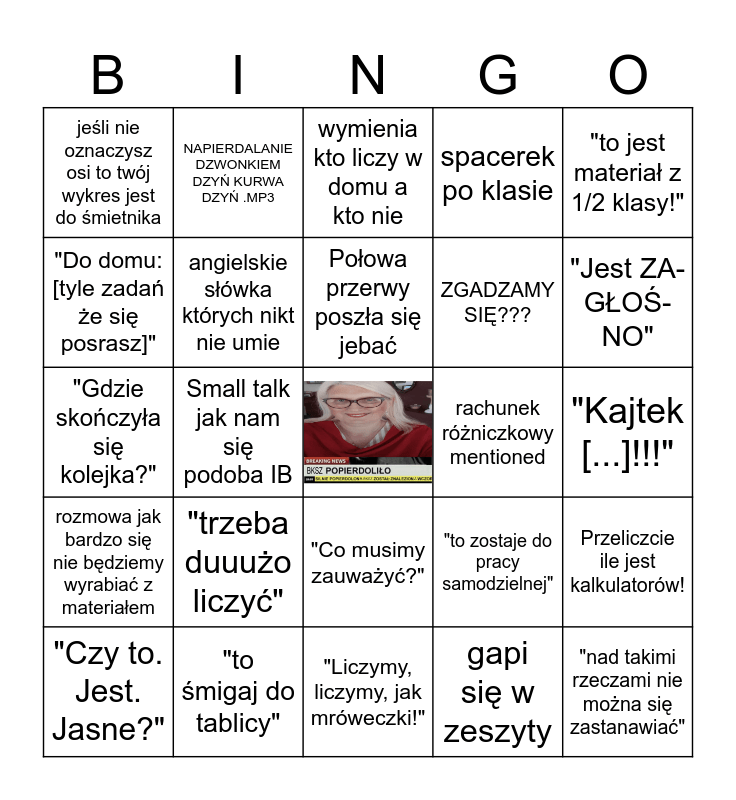 This bingo card has a free space and 24 words: "trzeba duuużo liczyć", "to śmigaj do tablicy", Połowa przerwy poszła się jebać, "Czy to. Jest. Jasne?", "to jest materiał z 1/2 klasy!", jeśli nie oznaczysz osi to twój wykres jest do śmietnika, "Do domu: [tyle zadań że się posrasz]", NAPIERDALANIE DZWONKIEM DZYŃ KURWA DZYŃ .MP3, rachunek różniczkowy mentioned, "Co musimy zauważyć?", ZGADZAMY SIĘ???, "Gdzie skończyła się kolejka?", "to zostaje do pracy samodzielnej", Przeliczcie ile jest kalkulatorów!, angielskie słówka których nikt nie umie, gapi się w zeszyty, "Kajtek [...]!!!", wymienia kto liczy w domu a kto nie, "Jest ZA-GŁOŚ-NO", Small talk jak nam się podoba IB, "nad takimi rzeczami nie można się zastanawiać", rozmowa jak bardzo się nie będziemy wyrabiać z materiałem, spacerek po klasie and "Liczymy, liczymy, jak mróweczki!".