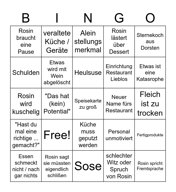This bingo card has 25 words: Free!, Sose, Heulsuse, Essen schmeckt nicht / nach gar nichts, Sternekoch aus Dorsten, Rosin braucht eine Pause, Schulden, veraltete Küche / Geräte, Neuer Name fürs Restaurant, Küche muss geputzt werden, Einrichtung Restaurant Lieblos, Rosin wird kuschelig, Personal unmotiviert, Fertigprodukte, Etwas wird mit Wein abgelöscht, Rosin spricht Fremtsprache, Fleich ist zu trocken, Alein stellungs merkmal, Etwas ist eine Katasrophe, "Das hat (kein) Potential", Speisekarte zu groß, Rosin sagt sie müssten eigendlich schlißen, "Hast du mal eine richtige ... gemacht?", Rosin lästert über Dessert and schlechter Witz oder Spruch von Rosin.