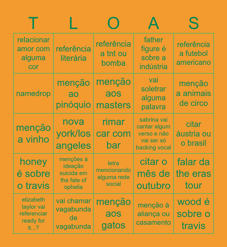 This bingo card has a free space and 24 words: menções à ideação suicida em the fate of ophelia, vai chamar vagabunda de vagabunda, menção aos masters, elizabeth taylor vai referenciar ready for it...?, referência a futebol americano, relacionar amor com alguma cor, namedrop, referência literária, sabrina vai cantar algum verso e não vai ser só backing vocal, letra mencionando alguma rede social, vai soletrar alguma palavra, menção a vinho, citar o mês de outubro, falar da the eras tour, menção ao pinóquio, menção à aliança ou casamento, citar áustria ou o brasil, referência a tnt ou bomba, menção a animais de circo, nova york/los angeles, wood é sobre o travis, honey é sobre o travis, father figure é sobre a indústria and menção aos gatos.