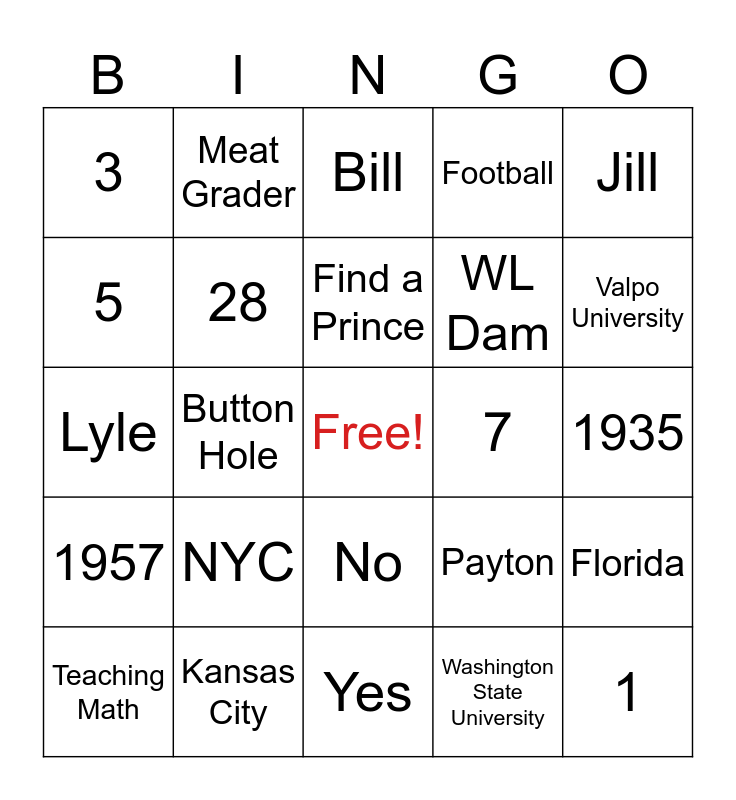 This bingo card has a free space and 38 words: 16, Bob Wohnrade, Datsun 280Z, 28, Florida, NYC, Find a Prince, Chemistry, Jill, WL Dam, Button Hole, Football, 1, 1935, 5, 1957, 22, Bill, 4, 7, 3, Kansas City, Valpo University, Teaching Math, Tennis, Yes, John Sorrenson, Morton Salt, American Can Company, Dura Wax, Barrel Racing, No, Washington State University, Meat Grader, Wednesday, Payton, Lyle and Brian.