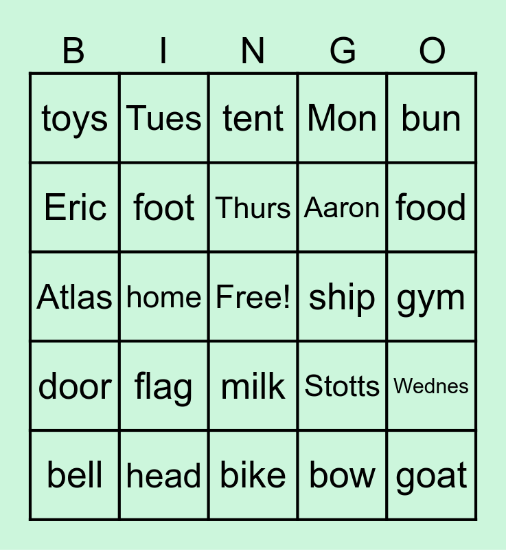 This bingo card has a free space and 29 words: bell, web, home, rat, toys, tent, foot, flag, ship, head, gym, goat, bike, bow, food, girl, milk, door, bun, Atlas, Stotts, Jaden, Aaron, Eric, Mon, Tues, Wednes, Thurs and Fri.