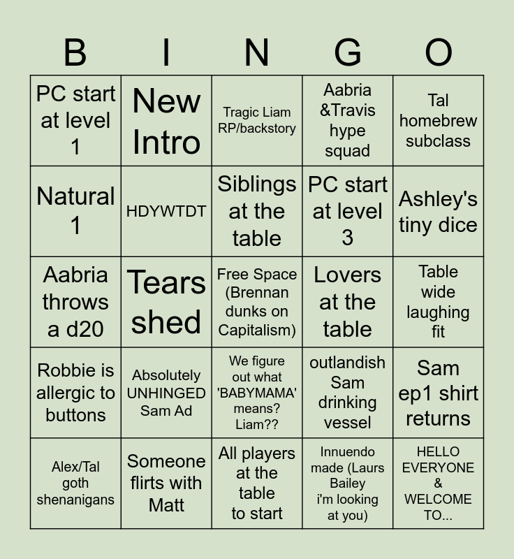This bingo card has a free space and 51 words: One word opening ie: "TIME", HELLO EVERYONE & WELCOME TO..., Players introduced one by one, All players at the table to start, Absolutely UNHINGED Sam Ad, Someone else does the Sam Ad, New Intro, Natural 20, Natural 1, Brennan wind sounds, HDYWTDT, Aabria &Travis hype squad, Sam ep1 shirt returns, outlandish Sam drinking vessel, Aabria PC is someone's ex, Travis furry joke, Siblings at the table, Lovers at the table, Exes at the table, Tal homebrew subclass, Tears shed, Innuendo made (Laurs Bailey i'm looking at you), PC start at level 1, PC start at level 3, Initiative rolled, Players dressed like their PCs, Ashley's tiny dice, lion noises from Travis, Alex/Tal goth shenanigans, Tragic Liam RP/backstory, Tragic Luis RP/backstory, Brennan almost forgets "is it thursday yet", "Mark Mercer", C4 merch dropped, "we're not in exandria anymore", Someone flirts with Matt, Matt's dice are cursed, Rival PC's at the table, Cute critter gets scritches (from Ashley), Matt misspeaks, gets torn to shreds, Table wide laughing fit, Robbie is allergic to buttons, Someone's accent vanishes at the break, Travis gets jumpscared, Ashley can't read her dice, A new Dice Goblin at the table, Aabria throws a d20, tables/groups revealed, Tal: "hm! this'll be interesting!", We figure out what 'BABYMAMA' means? Liam?? and Whitney PC called the wrong thing ie; Devil vs Demon.