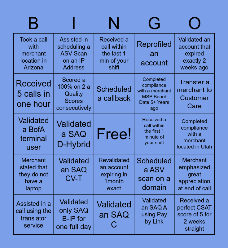 This bingo card has a free space and 24 words: Validated an SAQ CV-T, Validated only SAQ B-IP for one full day, Scheduled a callback, Assisted in a call using the translator service, Validated an account that expired exactly 2 weeks ago, Took a call with merchant location in Arizona, Received 5 calls in one hour, Assisted in scheduling a ASV Scan on an IP Address, Received a call within the first 1 minute of your shift, Revalidated an account expiring in 1month exact, Completed compliance with a merchant MSP Board Date 5+ Years ago, Validated a BofA terminal user, Scheduled a ASV scan on a domain, Merchant emphasized great appreciation at end of call, Scored a 100% on 2 a Quality Scores consecutively, Validated an SAQ A using Pay by Link, Completed compliance with a merchant located in Utah, Received a call within the last 1 min of your shift, Transfer a merchant to Customer Care, Validated a SAQ D-Hybrid, Received a perfect CSAT score of 5 for 2 weeks straight, Merchant stated that they do not have a laptop, Reprofiled an account and Validated an SAQ C.