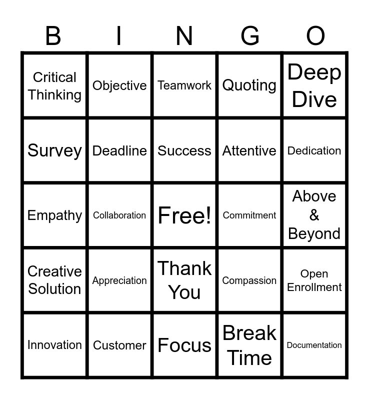 This bingo card has a free space and 33 words: Mission Possible, Effortless Experience, Collaboration, Communication, Creative Solution, Deadline, Deep Dive, Innovation, Objective, Strategy, Success, Teamwork, Key Drivers, Excellence, Commitment, Dedication, Customer, Empathy, Appreciation, Compassion, Thank You, Intuitive, Critical Thinking, Above & Beyond, Focus, Documentation, Quoting, Attentive, Survey, Open Enrollment, Customer Service Week, Break Time and PTO.