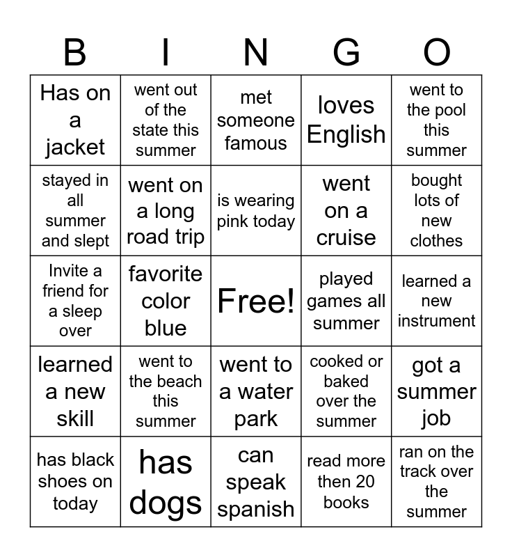 This bingo card has a free space and 24 words: went to the beach this summer, has dogs, is wearing pink today, has black shoes on today, went to the pool this summer, Has on a jacket, stayed in all summer and slept, went out of the state this summer, played games all summer, went to a water park, went on a cruise, Invite a friend for a sleep over, cooked or baked over the summer, got a summer job, went on a long road trip, read more then 20 books, learned a new instrument, met someone famous, bought lots of new clothes, favorite color blue, ran on the track over the summer, learned a new skill, loves English and can speak spanish.