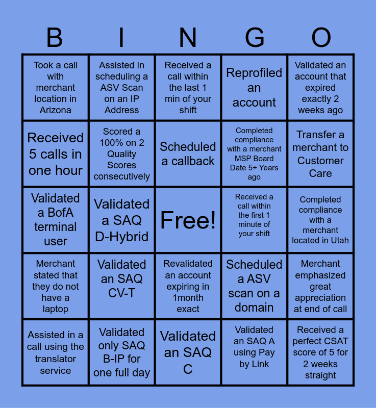 This bingo card has a free space and 24 words: Validated an SAQ CV-T, Validated only SAQ B-IP for one full day, Scheduled a callback, Assisted in a call using the translator service, Validated an account that expired exactly 2 weeks ago, Took a call with merchant location in Arizona, Received 5 calls in one hour, Assisted in scheduling a ASV Scan on an IP Address, Received a call within the first 1 minute of your shift, Revalidated an account expiring in 1month exact, Completed compliance with a merchant MSP Board Date 5+ Years ago, Validated a BofA terminal user, Scheduled a ASV scan on a domain, Merchant emphasized great appreciation at end of call, Scored a 100% on 2 Quality Scores consecutively, Validated an SAQ A using Pay by Link, Completed compliance with a merchant located in Utah, Received a call within the last 1 min of your shift, Transfer a merchant to Customer Care, Validated a SAQ D-Hybrid, Received a perfect CSAT score of 5 for 2 weeks straight, Merchant stated that they do not have a laptop, Reprofiled an account and Validated an SAQ C.