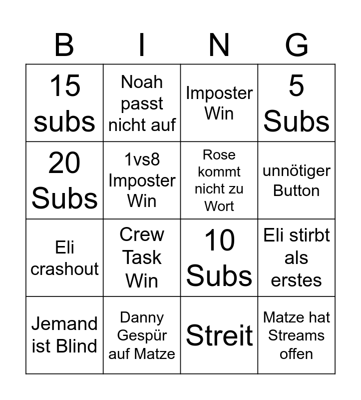 This bingo card has 16 words: Danny Gespür auf Matze, Eli stirbt als erstes, Imposter Win, 15 subs, Eli crashout, Noah passt nicht auf, 10 Subs, Streit, 20 Subs, 1vs8 Imposter Win, Jemand ist Blind, 5 Subs, Crew Task Win, unnötiger Button, Rose kommt nicht zu Wort and Matze hat Streams offen.