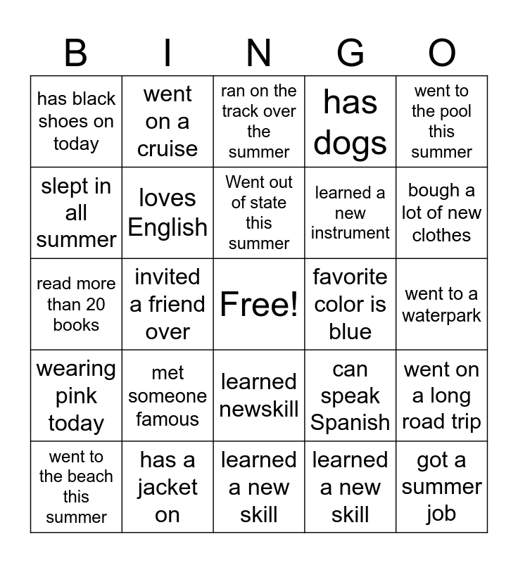 This bingo card has a free space and 26 words: learned newskill, learned a new skill, Went out of state this summer, has a jacket on, went to the pool this summer, has black shoes on today, slept in all summer, went on a cruise, went to a waterpark, can speak Spanish, learned a new instrument, read more than 20 books, went on a long road trip, went to the beach this summer, invited a friend over, played games all summer, has dogs, wearing pink today, ran on the track over the summer, got a summer job, bough a lot of new clothes, learned a new skill, favorite color is blue, met someone famous, loves English and Cooked or baked this summer.
