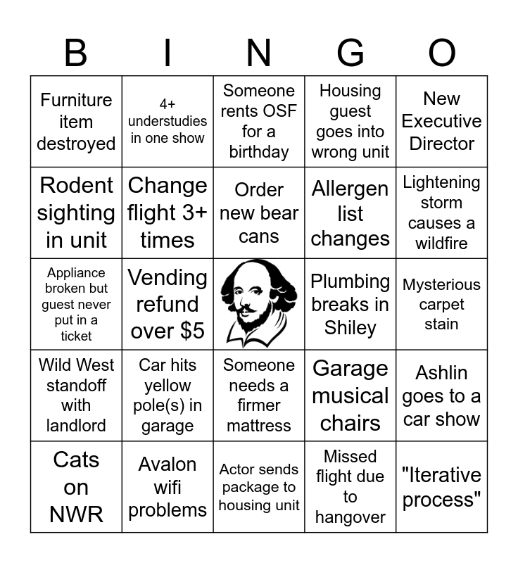 This bingo card has a free space and 34 words: Silverware in toilet, Missed flight due to hangover, Tara eats Cheetos, Karrie makes tasty bakes goods, Wild West standoff with landlord, Change flight 3+ times, New Executive Director, Cats on NWR, 4+ understudies in one show, Charge Friends & Family for repairs, Order new bear cans, Someone rents OSF for a birthday, Stuart retires for real, Spotted: Tim Bond in Varsity Jacket, Plumbing breaks in Shiley, Lightening storm causes a wildfire, Avalon wifi problems, Appliance broken but guest never put in a ticket, Car hits yellow pole(s) in garage, Garage musical chairs, Someone needs a firmer mattress, Missing a check, Furniture item destroyed, Mysterious carpet stain, Actor sends package to housing unit, "Iterative process", Housing guest goes into wrong unit, Entire office has 4 o'clock breakdown, Allergen list changes, Rodent sighting in unit, Zoey's Ice Cream trip, Vending refund over $5, Ashlin goes to a car show and Recology changes trash schedule.