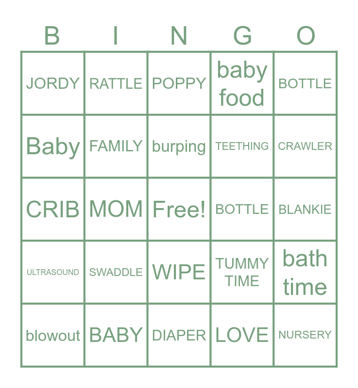 This bingo card has a free space and 30 words: BABY, DIAPER, MOM, DAD, JORDY, POPPY, FAMILY, WIPE, BOTTLE, DIAPER, BLANKIE, NURSERY, LOVE, NEWBORN, CRAWLER, WALKER, TUMMY TIME, ULTRASOUND, SWADDLE, BOTTLE, CRIB, PACIFIER, RATTLE, TEETHING, Baby, baby food, bath time, blowout, burping and colic.