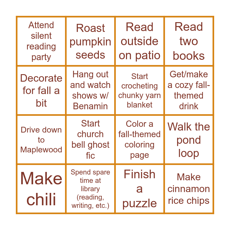 This bingo card has 16 words: Spend spare time at library (reading, writing, etc.), Walk the pond loop, Read outside on patio, Attend silent reading party, Drive down to Maplewood, Roast pumpkin seeds, Color a fall-themed coloring page, Finish a puzzle, Decorate for fall a bit, Hang out and watch shows w/ Benamin, Make chili, Read two books, Start church bell ghost fic, Get/make a cozy fall-themed drink, Start crocheting chunky yarn blanket and Make cinnamon rice chips.