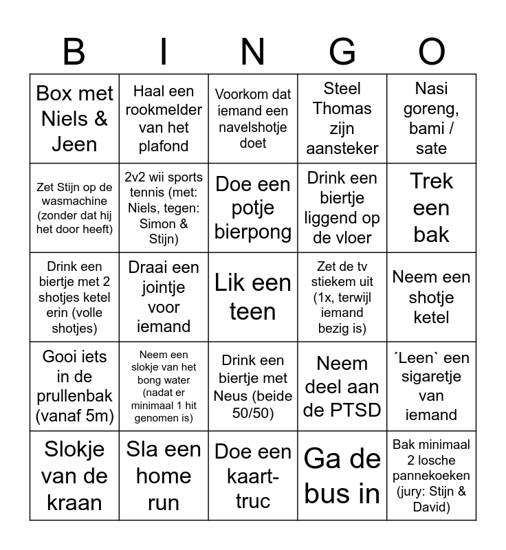 This bingo card has a free space and 24 words: Neem een slokje van het bong water (nadat er minimaal 1 hit genomen is), Sla een home run, Doe een potje bierpong, Slokje van de kraan, Nasi goreng, bami / sate, Box met Niels & Jeen, Zet Stijn op de wasmachine (zonder dat hij het door heeft), Haal een rookmelder van het plafond, Zet de tv stiekem uit (1x, terwijl iemand bezig is), Drink een biertje met Neus (beide 50/50), Drink een biertje liggend op de vloer, Drink een biertje met 2 shotjes ketel erin (volle shotjes), Neem deel aan de PTSD, ´Leen` een sigaretje van iemand, 2v2 wii sports tennis (met: Niels, tegen: Simon & Stijn), Ga de bus in, Neem een shotje ketel, Voorkom dat iemand een navelshotje doet, Trek een bak, Draai een jointje voor iemand, Bak minimaal 2 losche pannekoeken (jury: Stijn & David), Gooi iets in de prullenbak (vanaf 5m), Steel Thomas zijn aansteker and Doe een kaart-truc.