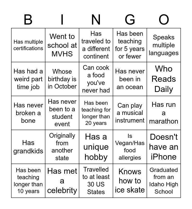 This bingo card has 25 words: Originally from another state, Travelled to at least 30 US States, Can cook a food you've never had, Has been teaching longer than 10 years, Speaks multiple languages, Has multiple certifications, Has had a weird part time job, Went to school at MVHS, Can play a musical instrument, Has a unique hobby, Has never been in an ocean, Has never broken a bone, Is Vegan/Has food allergies, Doesn't have an iPhone, Whose birthday is in October, Graduated from an Idaho High School, Has run a marathon, Has traveled to a different continent, Who Reads Daily, Has never been to a student event, Has been teaching for longer than 20 years, Has met a celebrity, Has grandkids, Has been teaching for 5 years or fewer and Knows how to ice skate.