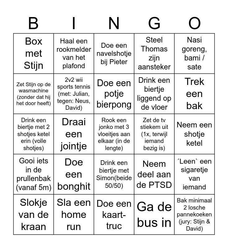 This bingo card has a free space and 24 words: Doe een bonghit, Sla een home run, Doe een potje bierpong, Slokje van de kraan, Nasi goreng, bami / sate, Box met Stijn, Zet Stijn op de wasmachine (zonder dat hij het door heeft), Haal een rookmelder van het plafond, Zet de tv stiekem uit (1x, terwijl iemand bezig is), Drink een biertje met Simon(beide 50/50), Drink een biertje liggend op de vloer, Drink een biertje met 2 shotjes ketel erin (volle shotjes), Neem deel aan de PTSD, ´Leen` een sigaretje van iemand, 2v2 wii sports tennis (met: Julian, tegen: Neus, David), Ga de bus in, Neem een shotje ketel, Doe een navelshotje bij Pieter, Trek een bak, Draai een jointje, Bak minimaal 2 losche pannekoeken (jury: Stijn & David), Gooi iets in de prullenbak (vanaf 5m), Steel Thomas zijn aansteker and Doe een kaart-truc.