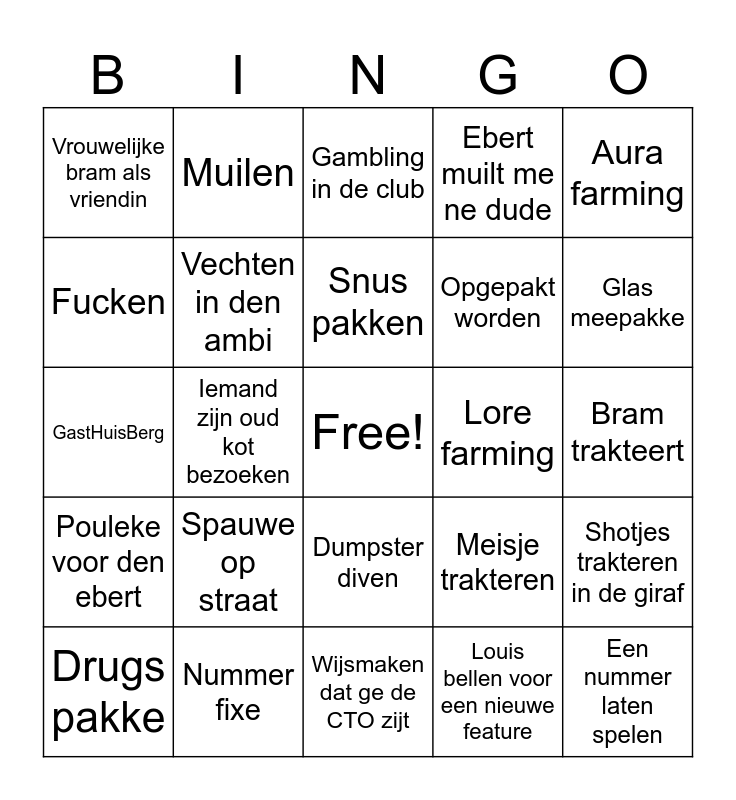 This bingo card has a free space and 24 words: Spauwe op straat, Nummer fixe, Snus pakken, Drugs pakke, Aura farming, Vrouwelijke bram als vriendin, Fucken, Muilen, Lore farming, Dumpster diven, Opgepakt worden, GastHuisBerg, Meisje trakteren, Shotjes trakteren in de giraf, Vechten in den ambi, Louis bellen voor een nieuwe feature, Bram trakteert, Gambling in de club, Glas meepakke, Iemand zijn oud kot bezoeken, Een nummer laten spelen, Pouleke voor den ebert, Ebert muilt me ne dude and Wijsmaken dat ge de CTO zijt.