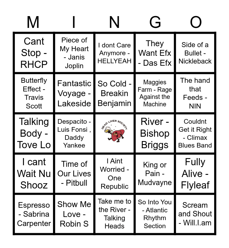 This bingo card has a free space and 26 words: I Aint Worried - One Republic, So Into You - Atlantic Rhythm Section, So Cold - Breakin Benjamin, Show Me Love - Robin S, Side of a Bullet - Nickleback, Cant Stop - RHCP, Butterfly Effect - Travis Scott, Piece of My Heart - Janis Joplin, Couldnt Get it Right - Climax Blues Band, King or Pain - Mudvayne, Maggies Farm - Rage Against the Machine, Talking Body - Tove Lo, Fully Alive - Flyleaf, Espresso - Sabrina Carpenter, Despacito - Luis Fonsi , Daddy Yankee, Back to the Hotel - N2Deep, They Want Efx - Das Efx, I cant Wait Nu Shooz, I dont Care Anymore - HELLYEAH, Scream and Shout - Will.I.am, The hand that Feeds - NIN, Take me to the River - Talking Heads, River - Bishop Briggs, Time of Our Lives - Pitbull, Fantastic Voyage - Lakeside and Colors - Black Pumas.