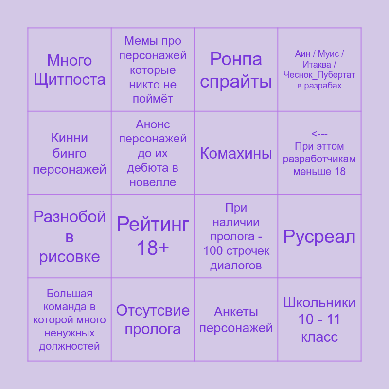 This bingo card has 16 words: Отсутсвие пролога, Русреал, Ронпа спрайты, Много Щитпоста, Разнобой в рисовке, Мемы про персонажей которые никто не поймёт, При наличии пролога - 100 строчек диалогов, Анкеты персонажей, Кинни бинго персонажей, Анонс персонажей до их дебюта в новелле, Большая команда в которой много ненужных должностей, Аин / Муис / Итаква / Чеснок_Пубертат в разрабах, Рейтинг 18+, <--- При эттом разработчикам меньше 18, Комахины and Школьники 10 - 11 класс.