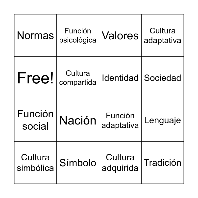 This bingo card has 16 words: Símbolo, Lenguaje, Valores, Normas, Función social, Función psicológica, Función adaptativa, Cultura adquirida, Free!, Cultura compartida, Cultura simbólica, Cultura adaptativa, Nación, Sociedad, Identidad and Tradición.