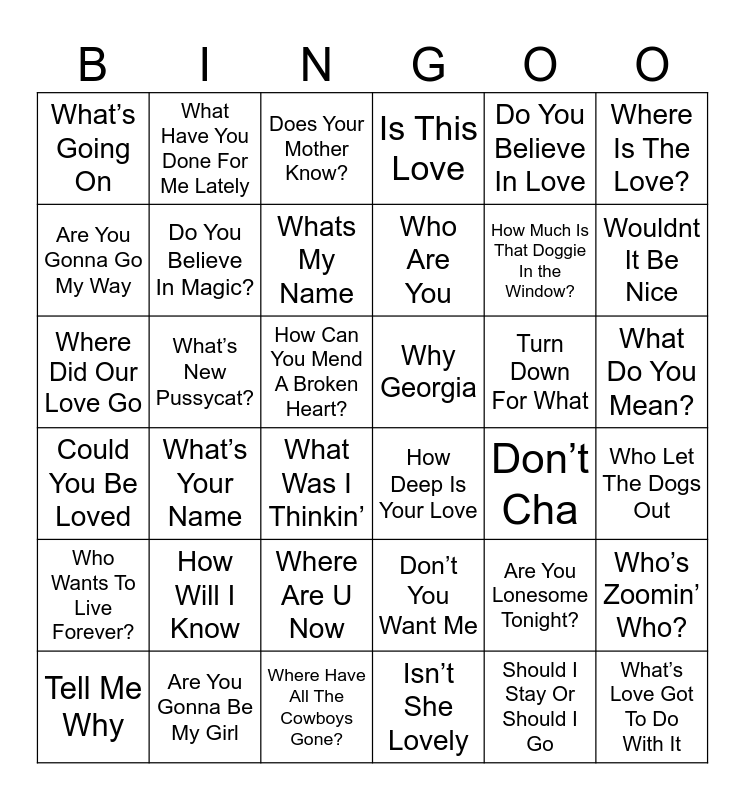 This bingo card has 46 words: Remember The Time, Where Did Our Love Go, Who Am I, Don’t Cha, Turn Down For What, Don’t You Want Me, What Have You Done For Me Lately, What About Your Friends, Where Is The Love?, Are You Gonna Be My Girl, Are You Gonna Go My Way, Is This Love, What’s Your Name, Could You Be Loved, Should I Stay Or Should I Go, Where Are U Now, Do You Believe In Magic?, What’s New Pussycat?, Free!, Do You Believe In Love, Wouldnt It Be Nice, Who Let The Dogs Out, What’s Going On, Whats My Name, Have You Ever Seen The Rain, Who Are You, What Was I Thinkin’, What Is Love, What Do You Mean?, Why Georgia, Why Can’t We Be Friends?, How Will I Know, Isn’t She Lovely, What’s Love Got To Do With It, Where Have All The Cowboys Gone?, How Deep Is Your Love, How Can You Mend A Broken Heart?, Tell Me Why, Are You Ready For It?, Are You Lonesome Tonight?, Who Wants To Live Forever?, Does Your Mother Know?, How Much Is That Doggie In the Window?, What’s The Frequency, Kenneth?, Who’s Zoomin’ Who? and Can You Feel The Love Tonight?.