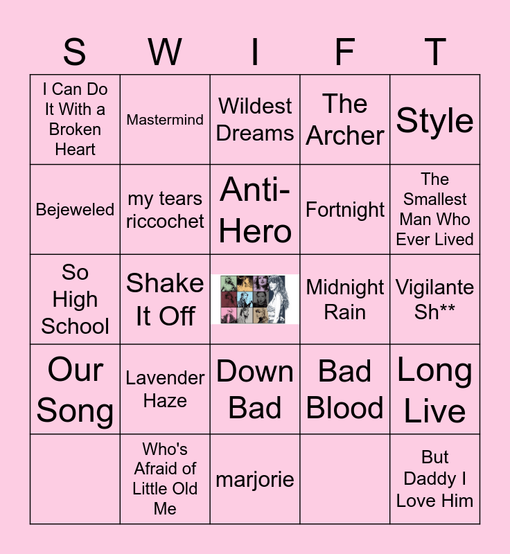 This bingo card has a free space and 25 words: So High School, Don't Blame Me, marjorie, Bad Blood, Style, I Can Do It With a Broken Heart, my tears riccochet, Wildest Dreams, Fortnight, But Daddy I Love Him, Bejeweled, Shake It Off, Down Bad, Midnight Rain, The Smallest Man Who Ever Lived, Our Song, Who's Afraid of Little Old Me, Anti-Hero, The Archer, Vigilante Sh**, Lavender Haze, Karma, Long Live, Mastermind and End Game.