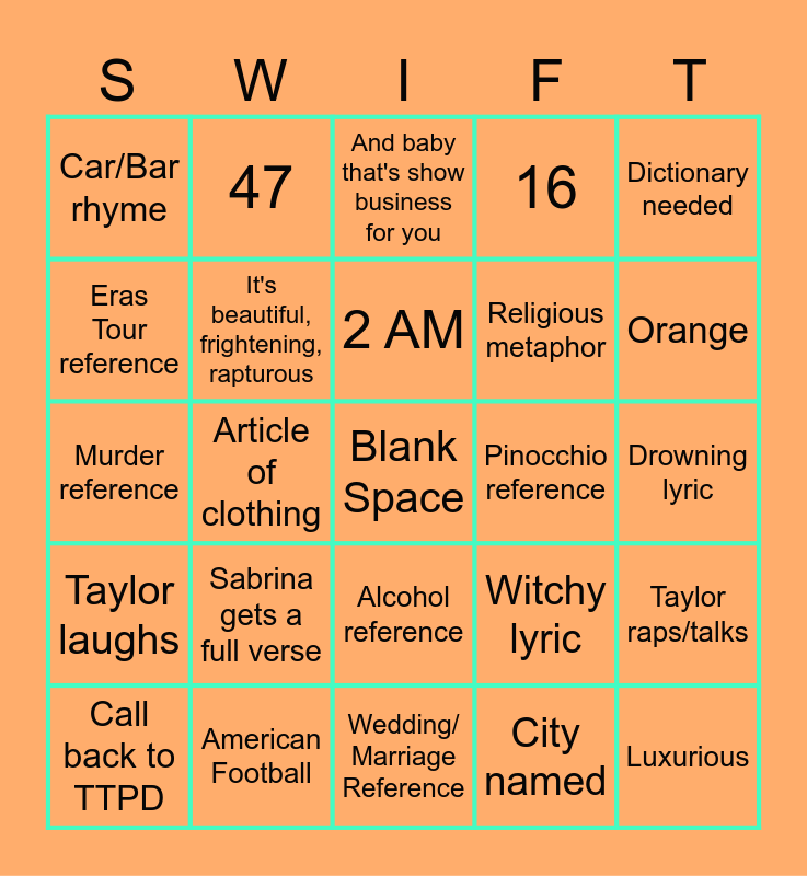 This bingo card has a free space and 24 words: Call back to TTPD, Sabrina gets a full verse, 2 AM, City named, Dictionary needed, Car/Bar rhyme, 47, And baby that's show business for you, Pinocchio reference, Drowning lyric, Murder reference, It's beautiful, frightening, rapturous, Witchy lyric, Taylor raps/talks, Eras Tour reference, American Football, Wedding/ Marriage Reference, 16, Orange, Taylor laughs, Article of clothing, Alcohol reference, Religious metaphor and Luxurious.