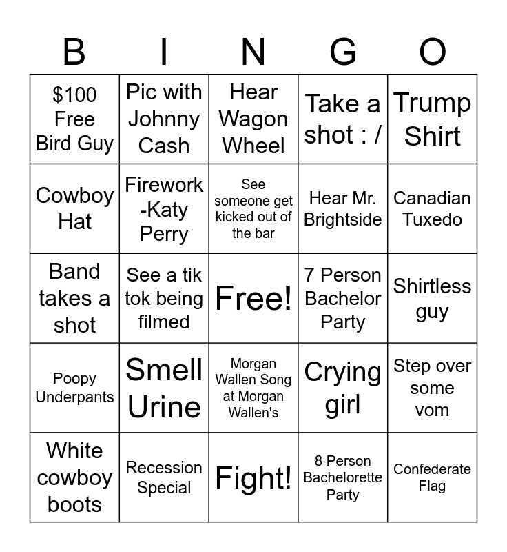This bingo card has a free space and 24 words: Smell Urine, Recession Special, See someone get kicked out of the bar, White cowboy boots, Trump Shirt, $100 Free Bird Guy, Cowboy Hat, Pic with Johnny Cash, 7 Person Bachelor Party, Morgan Wallen Song at Morgan Wallen's, Hear Mr. Brightside, Band takes a shot, Crying girl, Step over some vom, Firework -Katy Perry, 8 Person Bachelorette Party, Shirtless guy, Hear Wagon Wheel, Canadian Tuxedo, See a tik tok being filmed, Confederate Flag, Poopy Underpants, Take a shot : / and Fight!.