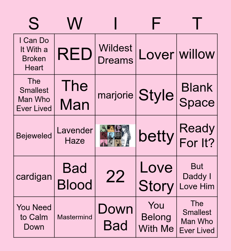 This bingo card has a free space and 25 words: You Need to Calm Down, Bad Blood, marjorie, You Belong With Me, Blank Space, I Can Do It With a Broken Heart, RED, Wildest Dreams, Style, But Daddy I Love Him, Bejeweled, The Man, Love Story, The Smallest Man Who Ever Lived, The Smallest Man Who Ever Lived, Who's Afraid of Little Old Me, Down Bad, Lover, Ready For It?, cardigan, Lavender Haze, 22, betty, willow and Mastermind.