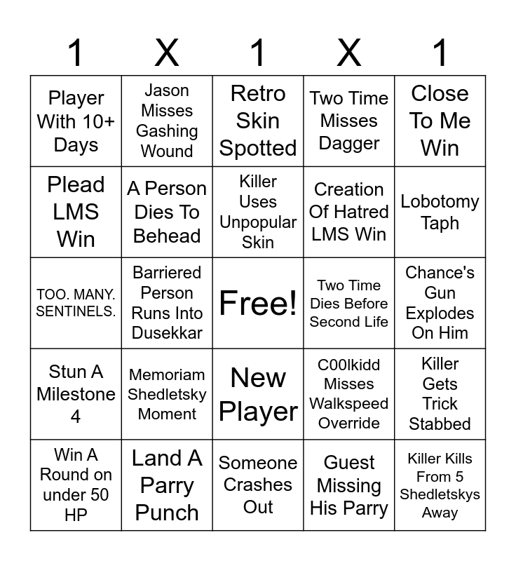This bingo card has a free space and 24 words: Memoriam Shedletsky Moment, Land A Parry Punch, Killer Uses Unpopular Skin, Win A Round on under 50 HP, Close To Me Win, Player With 10+ Days, Plead LMS Win, Jason Misses Gashing Wound, Two Time Dies Before Second Life, New Player, Creation Of Hatred LMS Win, TOO. MANY. SENTINELS., C00lkidd Misses Walkspeed Override, Killer Gets Trick Stabbed, A Person Dies To Behead, Guest Missing His Parry, Chance's Gun Explodes On Him, Retro Skin Spotted, Lobotomy Taph, Barriered Person Runs Into Dusekkar, Killer Kills From 5 Shedletskys Away, Stun A Milestone 4, Two Time Misses Dagger and Someone Crashes Out.