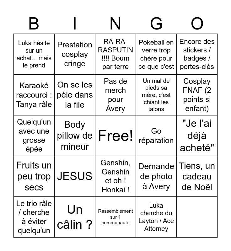 This bingo card has a free space and 24 words: Fruits un peu trop secs, Un câlin ?, Genshin, Genshin et oh ! Honkai !, Demande de photo à Avery, Encore des stickers / badges / portes-clés, Luka hésite sur un achat... mais le prend, Prestation cosplay cringe, RA-RA-RASPUTIN !!!! Boum par terre, Un mal de pieds sa mère, c'est chiant les talons, Tiens, un cadeau de Noël, Karaoké raccourci : Tanya râle, On se les pèle dans la file, FURRY, Go réparation, Cosplay FNAF (2 points si enfant), Le trio râle / cherche à éviter quelqu'un, Body pillow de mineur, Pas de merch pour Avery, Pokeball en verre trop chère pour ce que c'est, "Je l'ai déjà acheté", Quelqu'un avec une grosse épée, JESUS, Rassemblement sur 1 communauté and Luka cherche du Layton / Ace Attorney.