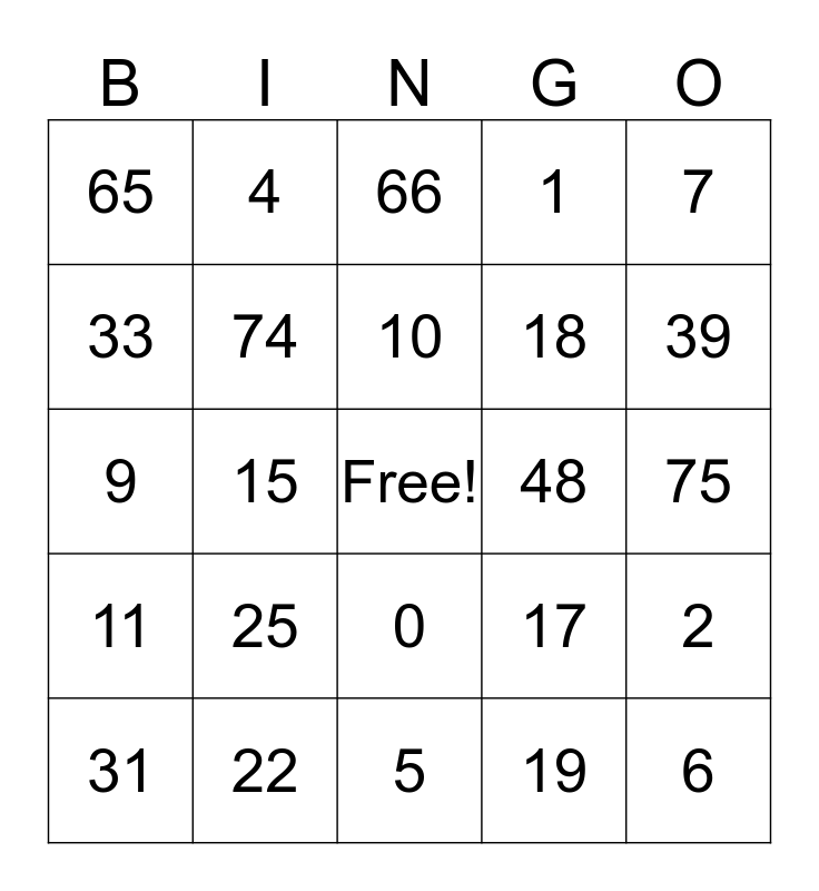This bingo card has a free space and 24 words: 25, 22, 10, 31, 7, 65, 33, 4, 48, 0, 18, 9, 17, 2, 74, 19, 75, 66, 39, 15, 6, 11, 1 and 5.
