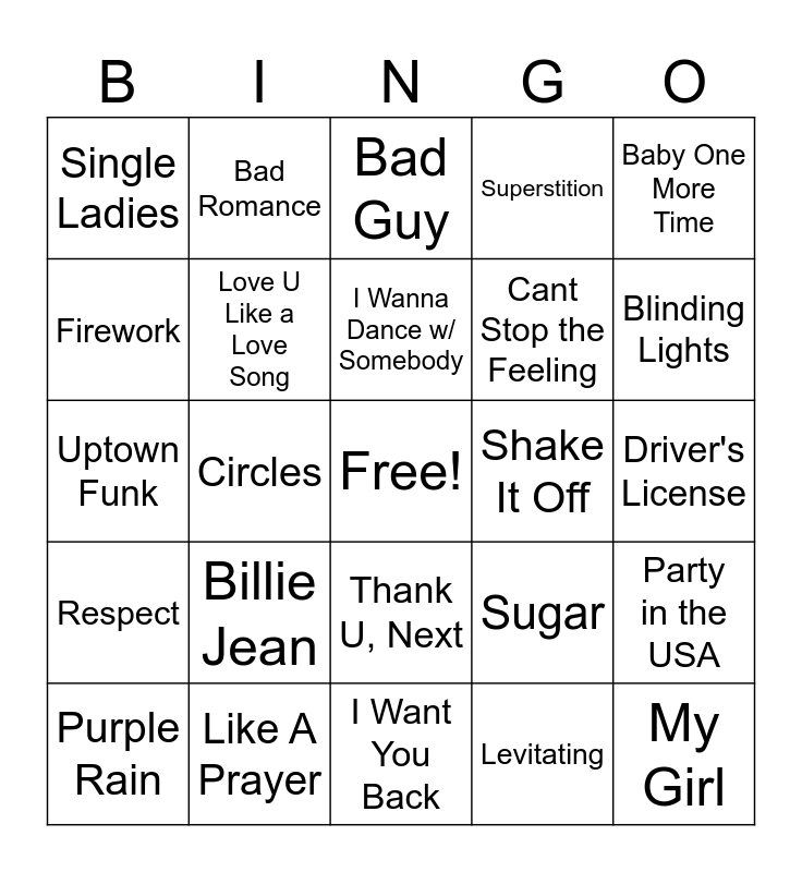 This bingo card has a free space and 24 words: Billie Jean, Like A Prayer, I Wanna Dance w/ Somebody, Purple Rain, Baby One More Time, Single Ladies, Firework, Bad Romance, Shake It Off, Thank U, Next, Cant Stop the Feeling, Uptown Funk, Sugar, Party in the USA, Love U Like a Love Song, Levitating, Driver's License, Bad Guy, Blinding Lights, Circles, My Girl, Respect, Superstition and I Want You Back.