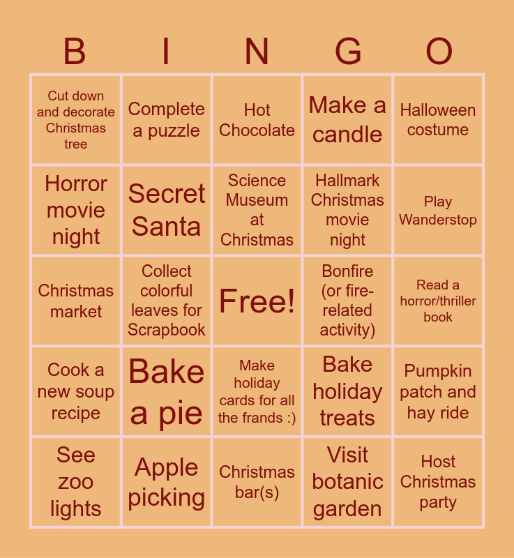 This bingo card has a free space and 24 words: Bake a pie, Apple picking, Science Museum at Christmas, See zoo lights, Halloween costume, Cut down and decorate Christmas tree, Horror movie night, Complete a puzzle, Bonfire (or fire-related activity), Make holiday cards for all the frands :), Hallmark Christmas movie night, Christmas market, Bake holiday treats, Pumpkin patch and hay ride, Secret Santa, Visit botanic garden, Read a horror/thriller book, Hot Chocolate, Play Wanderstop, Collect colorful leaves for Scrapbook, Host Christmas party, Cook a new soup recipe, Make a candle and Christmas bar(s).