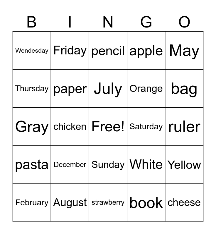 This bingo card has a free space and 24 words: December, August, July, February, May, Wendesday, Thursday, Friday, Saturday, Sunday, Orange, Gray, White, Yellow, paper, book, ruler, pencil, bag, chicken, cheese, pasta, apple and strawberry.