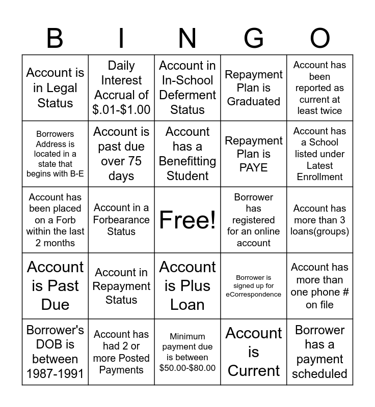 This bingo card has a free space and 24 words: Account in Repayment Status, Account has had 2 or more Posted Payments, Account has a Benefitting Student, Borrower's DOB is between 1987-1991, Account has been reported as current at least twice, Account is in Legal Status, Borrowers Address is located in a state that begins with B-E, Daily Interest Accrual of $.01-$1.00, Borrower has registered for an online account, Account is Plus Loan, Repayment Plan is PAYE, Account has been placed on a Forb within the last 2 months, Borrower is signed up for eCorrespondence, Account has more than one phone # on file, Account is past due over 75 days, Account is Current, Account has more than 3 loans(groups), Account in In-School Deferment Status, Account has a School listed under Latest Enrollment, Account in a Forbearance Status, Borrower has a payment scheduled, Account is Past Due, Repayment Plan is Graduated and Minimum payment due is between $50.00-$80.00.