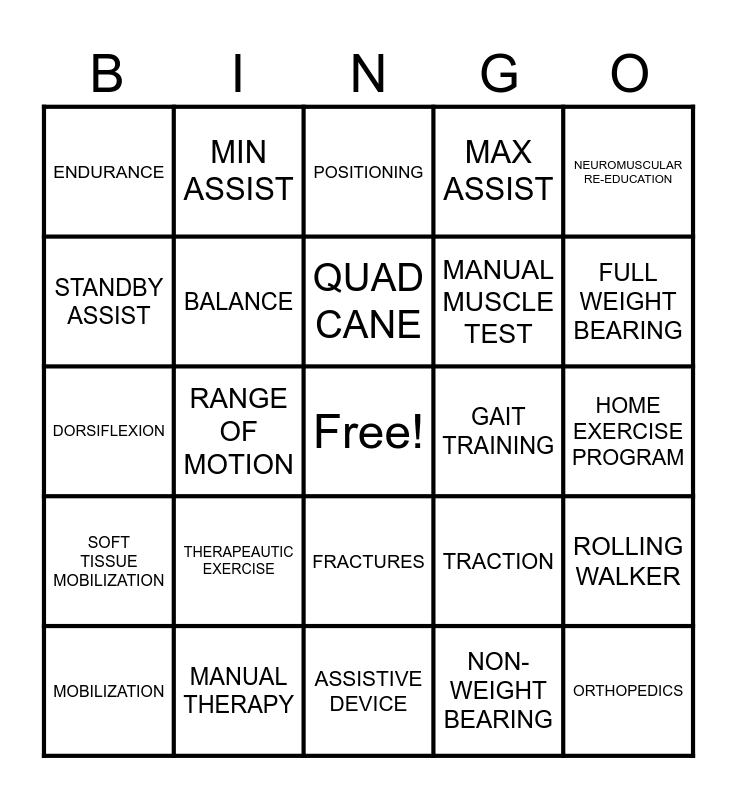 This bingo card has a free space and 29 words: MOBILIZATION, ACUTE CARE, RANGE OF MOTION, STRENGHENING, ENDURANCE, POSITIONING, BALANCE, THERAPEAUTIC EXERCISE, GAIT TRAINING, MANUAL THERAPY, HOME EXERCISE PROGRAM, ORTHOPEDICS, ASSISTIVE DEVICE, NON-WEIGHT BEARING, FULL WEIGHT BEARING, PARTIAL WEIGHT BEARING, FRACTURES, SOFT TISSUE MOBILIZATION, NEUROMUSCULAR RE-EDUCATION, DORSIFLEXION, TRACTION, ULTRASOUND, MANUAL MUSCLE TEST, STANDBY ASSIST, MAX ASSIST, MIN ASSIST, ROLLING WALKER, QUAD CANE and DORSIFLEXION.